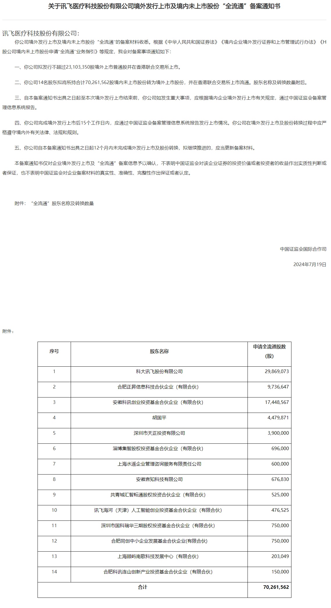 智通财经APP获悉,7月19日,中国证监会发布关于讯飞医疗科技股份有限公司境外发行上市及境内未上市股份“全流通”备案通知书。据悉,公司拟发行不超过23,103,350股境外上市普通股并在香港联合交易所上市,此外,公司14名股东拟将所持合计70,261,562股境内未上市股份转为境外上市股份,并在香港联合交易所上市流通。