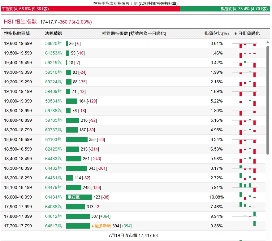 法兴恒指牛熊证街货分布图中的数据显示,熊证街货重货区在18000-18099区间,该区间最新熊证数量为423张,较上一交易减少38张;最多新增在17700-17799区间,该区间最新熊证数量为394张,较上一交易日增加394张。