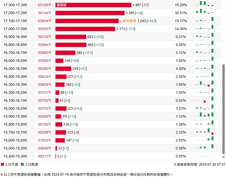 牛证街货重货区在17300-17399区间,该区间最新牛证数量为1487张,较上一交易日减少57张;最多新增在17100-17199区间,该区间最新牛证数量为1243张,较上一交易日增加443张。