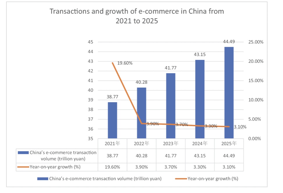 让我们先从行业市场来看,在零售市场扩张和在线渗透率不断提高的推动下,中国电子商务行业经历了巨大的增长。根据商务部发布的《中国电子商务报告》,2022年,中国全国电子商务交易量为40.28万亿元(人民币,下同),同比增长率为3.9%。预计到2025年,中国的电子商务交易量将达到44.49万亿元。