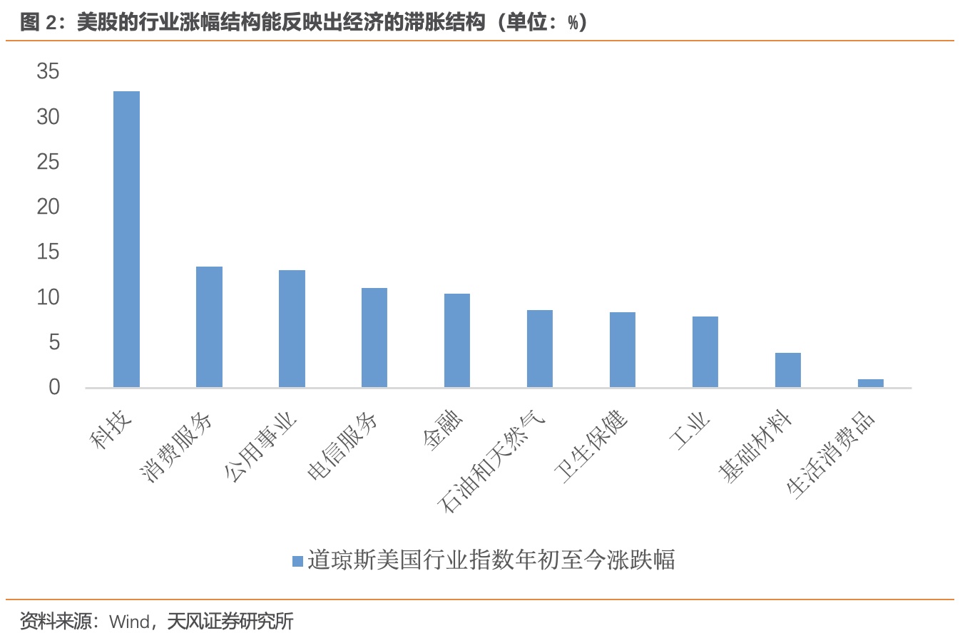美股的涨幅结构也反映了经济的滞胀结构,今年美股涨幅最高的板块是科技类和稳定类(公用事业、电信服务、金融),分别代表跑赢滞和跑赢胀的两类资产。