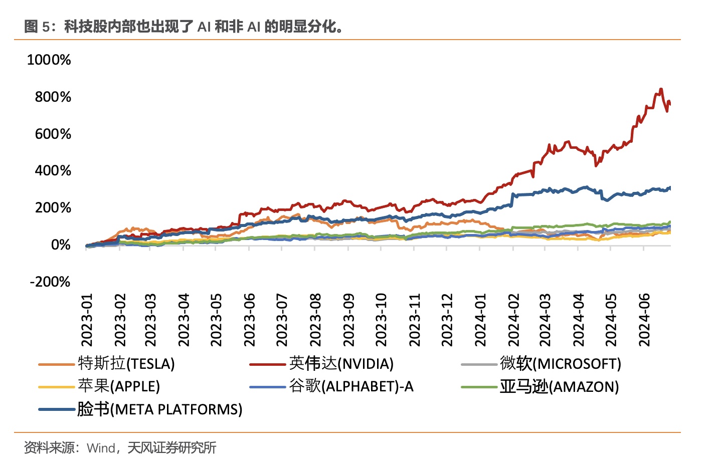 “七姐妹”约占标普500指数的30%(按照6月30日市值估算),但与AI相关度低的科技公司股价走势相对较弱,按权重估算不含“七姐妹”的标普500指数仅上涨3-4%。