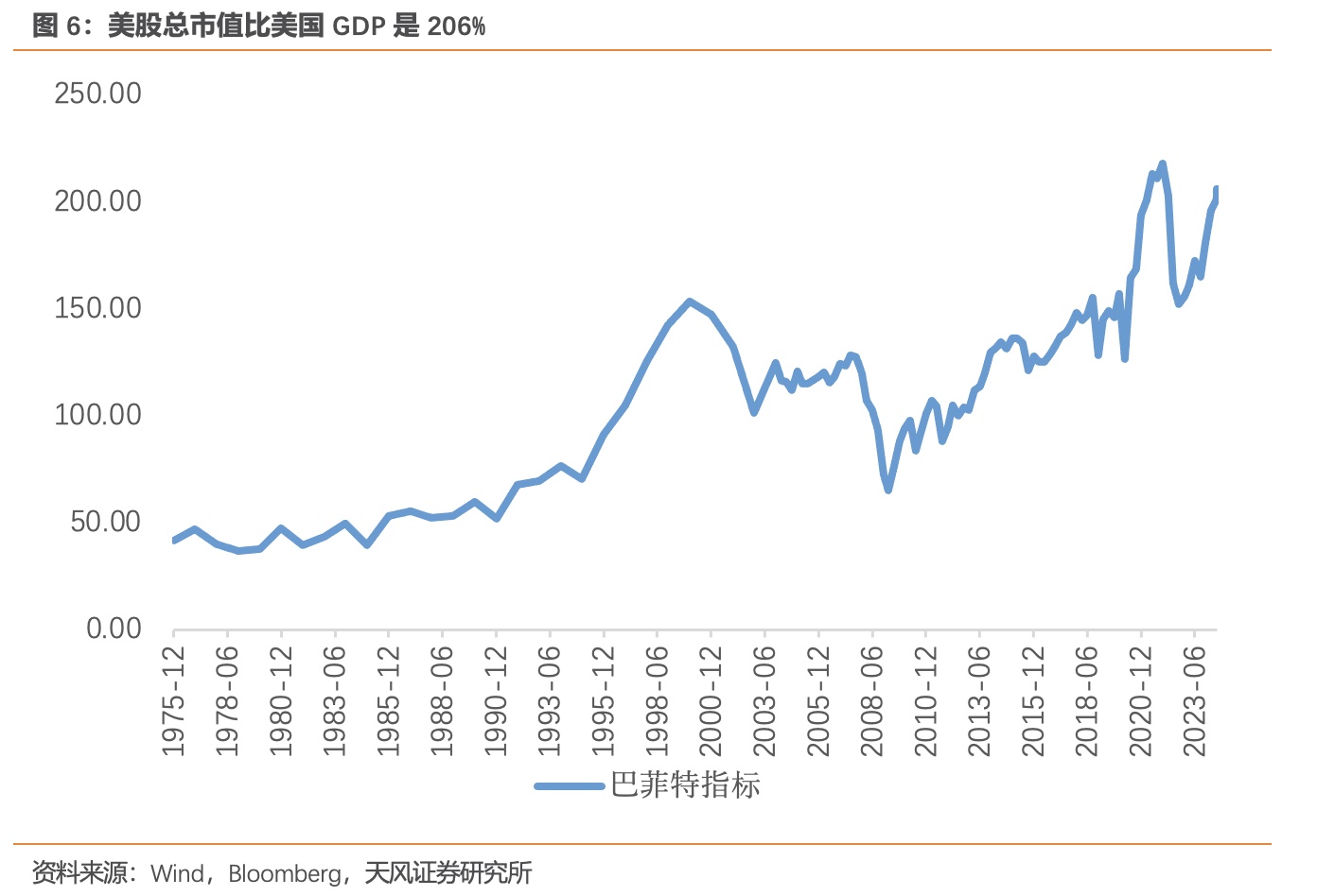 比如著名的巴菲特指标(美股总市值比美国GDP)截止7月12日是206%,创下2022年3月以来的新高,远高于危险值。巴菲特也在股东大会上提到,