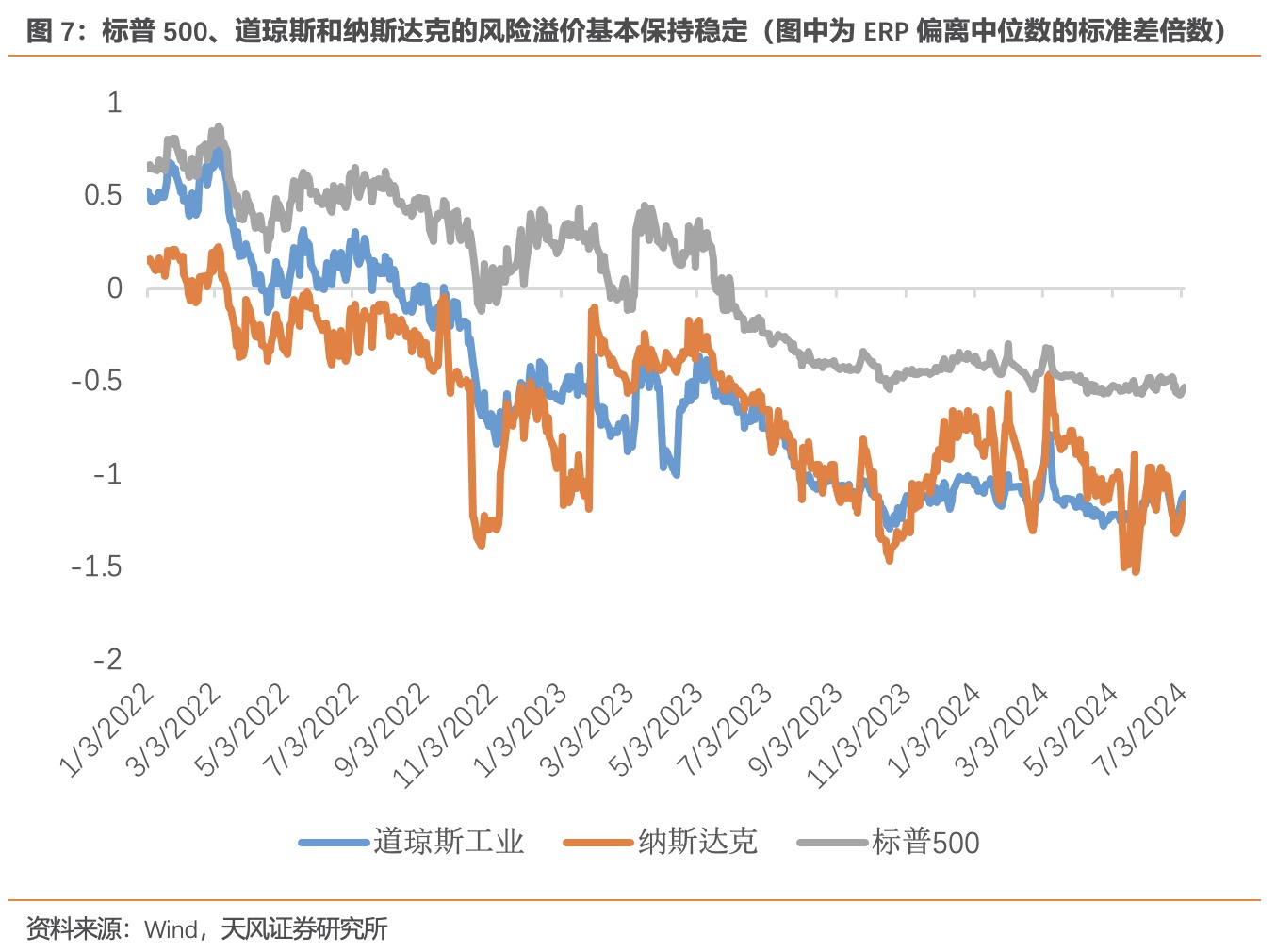 截止七月初,标普500、道琼斯、纳斯达克的风险溢价分别位于35%、18%、16%历史分位,处于中位数以下0.53、1.10、1.15个标准差。