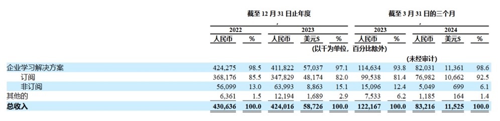 截至2022、2023年度及截至2023年、2024年前三个月,云学堂收入分别为4.31亿元、4.24亿元、1.22亿及8320万元人民币。其中,订阅收入占收比分别为85.5%、82.0%、81.4%及92.5%。