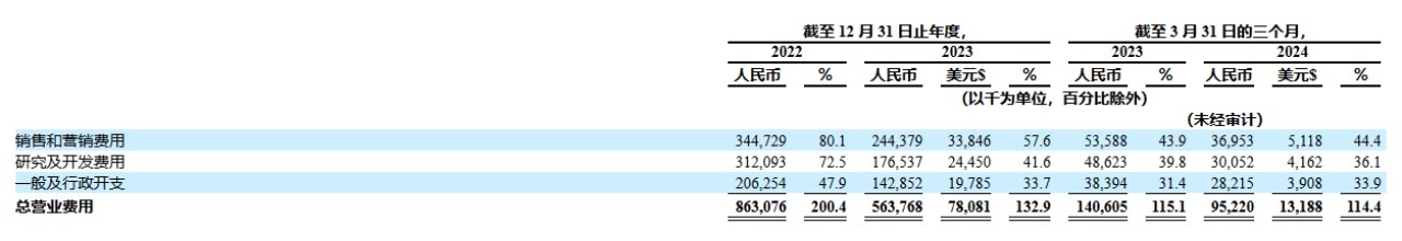 其中,销售及营销费用占据了公司经营费用的最大头。2022年度,仅销售和营销一项费用就占据了公司总收入的80.1%,至2024年前三个月,公司销售及营销费用占收比也达近半。