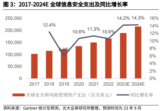 生成式AI使得网络攻击的门槛降低,同时也加强了网络安全工具的监测和应对能力,有望在供需两侧同时促进全球信息安全支出的增长;同时,24年全球主要国家大选、地缘政治冲突升级等因素也为信息安全提出了更高的要求。