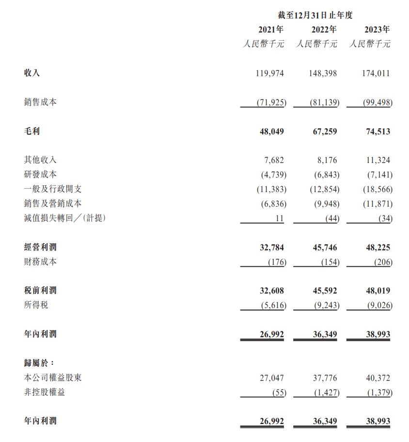 财务方面,近年来众淼创新科技的业绩有着显著增长,营收与利润双双高增。2021年、2022年及2023年,众淼创科实现收入分别约为1.20亿元、1.48亿元及1.74亿元,复合年增长率为20.4%;净利润分别约为0.27亿元及0.36亿元及0.39亿元。