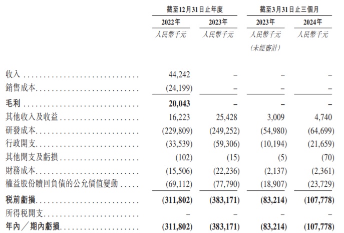 财务方面,2022年、2023年及截至2024年3月31日止三个月,同源康医药研发成本分别约为人民币2.30亿元、2.49亿元、6469.9万元,年内╱期内亏损分别约为3.12亿元、3.83亿元、1.08亿元。