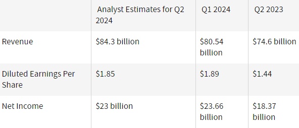 智通财经获悉,谷歌母公司Alphabet(GOOGL.US)将于北京时间周三晨间美股盘后公布第二季度财报,投资者将重点关注其云业务的持续增长和人工智能(AI)计划的最新进展。根据Visible Alpha的数据,分析师预计该公司Q2营收将达到843亿美元,同比增长13%。净利润预计将达到230亿美元,即每股1.85美元,同比增长25%。