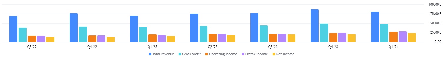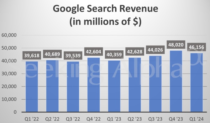 不断扩大的谷歌云客户预计将推动Alphabet 2024年第二季度的营收增长。谷歌云部门的收入来自谷歌云平台服务和谷歌工作空间协作工具收取的费用,一直在推动Alphabet的收入大幅增长。2024年第一季度,谷歌云收入同比增长28.4%,达到96亿美元,占该季度总收入的11.9%。