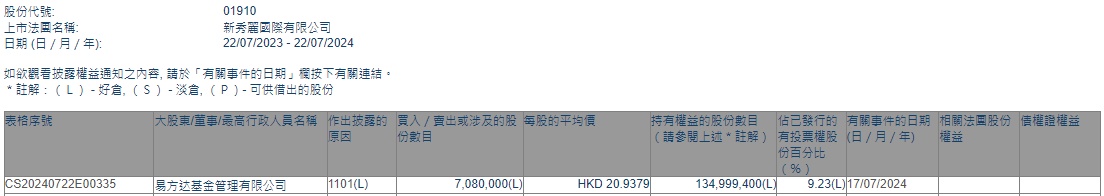 智通财经APP获悉,香港联交所最新资料显示,7月17日,易方达基金增持新秀丽(01910)708万股,每股作价20.9379港元,总金额约为1.48亿港元。增持后最新持股数目约为1.35亿股,最新持股比例为9.23%。