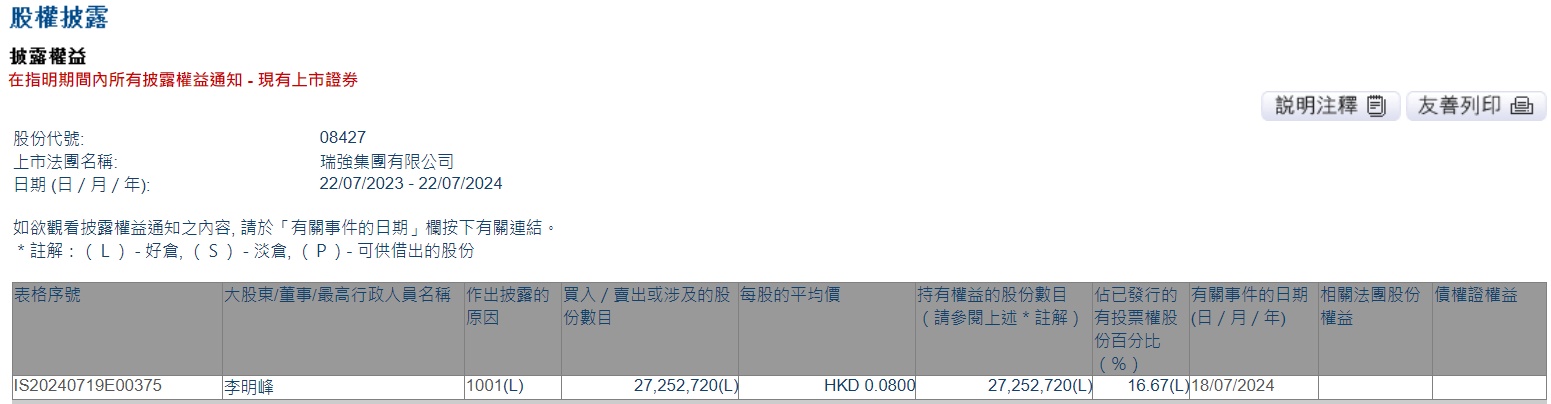 智通财经APP获悉,香港联交所最新资料显示,7月18日,李明峰增持瑞强集团(08427)2725.272万股,每股作价0.08港元,总金额约为218.02万港元。增持后最新持股数目为2725.272万股,最新持股比例为16.67%。