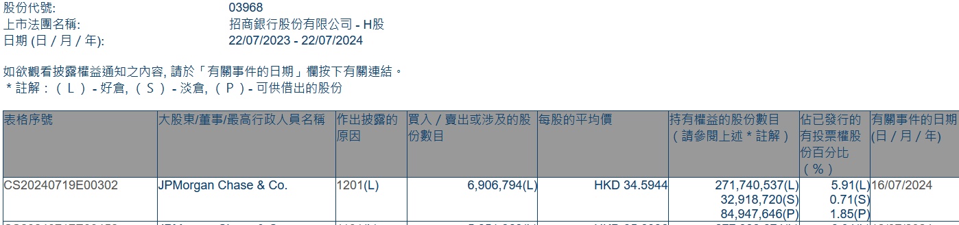 智通财经APP获悉,香港联交所最新资料显示,7月16日,摩根大通减持招商银行(03968)690.6794万股,平均每股作价34.5944港元,总金额约为2.39亿港元。减持后最新持股数目约为2.717亿股,持股比例为5.91%。