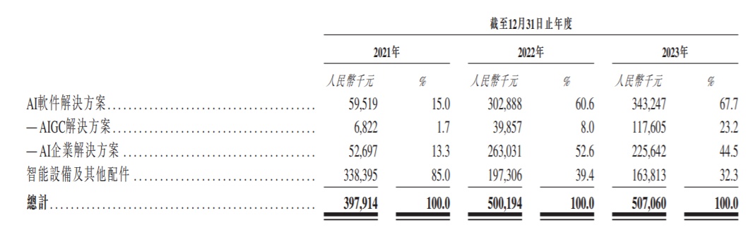据悉,目前出门问问目前营收主要由AI软件解决方案与智能设备及其他配件构成,2023年两者营收占比分别为67.7%、32.3%。在这其中,公司的AI软件解决方案又分为AIGC解决方案和AI企业解决方案,同期两者营收占比分别为23.2%、44.5%。
