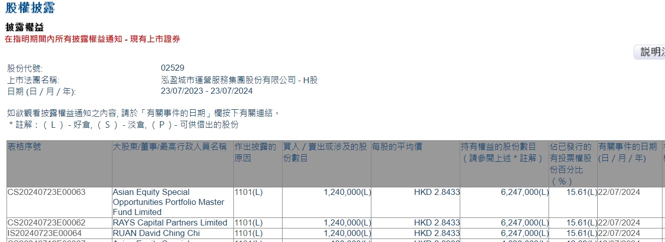 Limited增持泓盈城市服务(02529)124万股,每股作价2.8433港元,总金额约为352.57万港元。增持后最新持股数目为624.7万股,最新持股比例为15.61%。