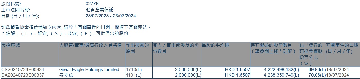 智通财经APP获悉,香港联交所最新资料显示,7月18日,集团主席罗嘉瑞增持冠君产业信托(02778)200万股,每股作价1.6507港元,总金额为330.14万港元。增持后最新持股数目约为42.38亿股,最新持股比例为70.06%。