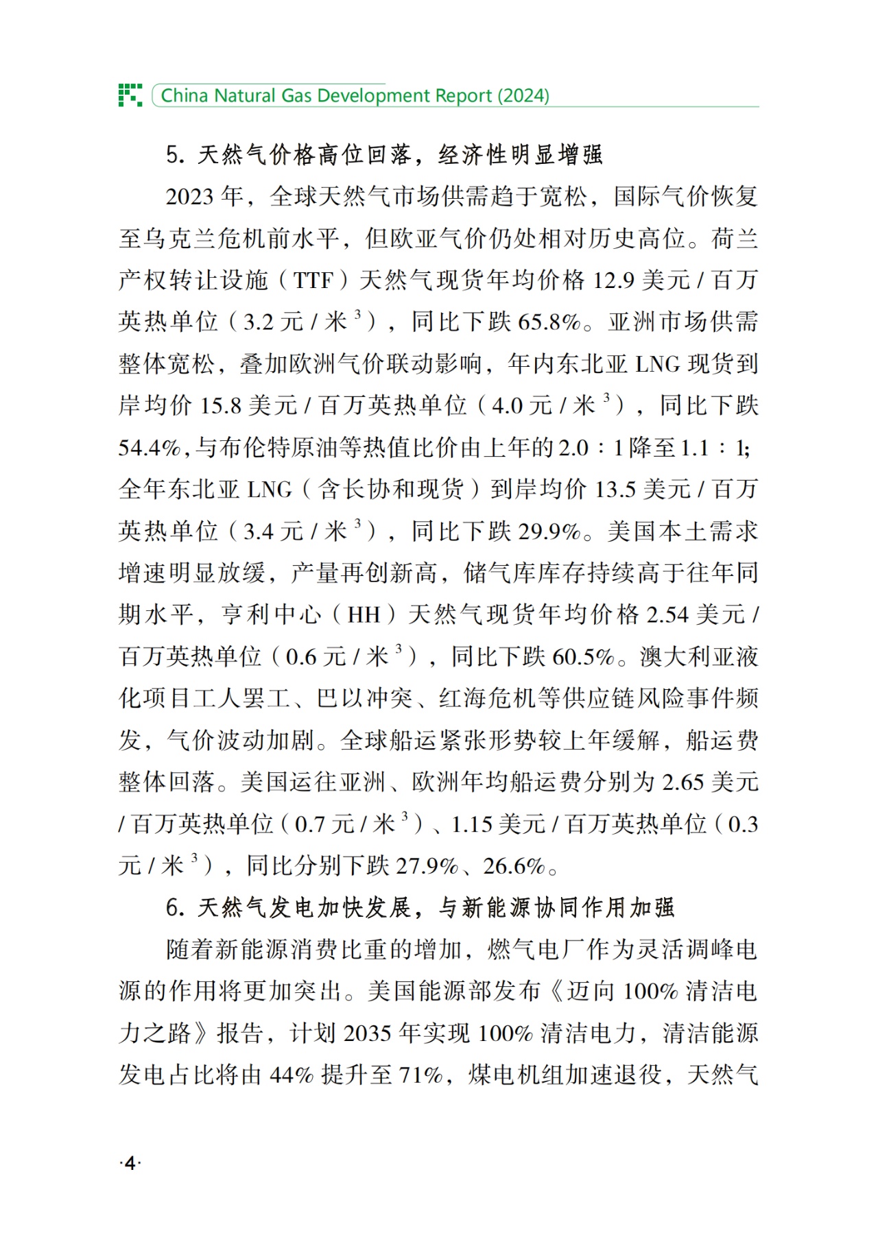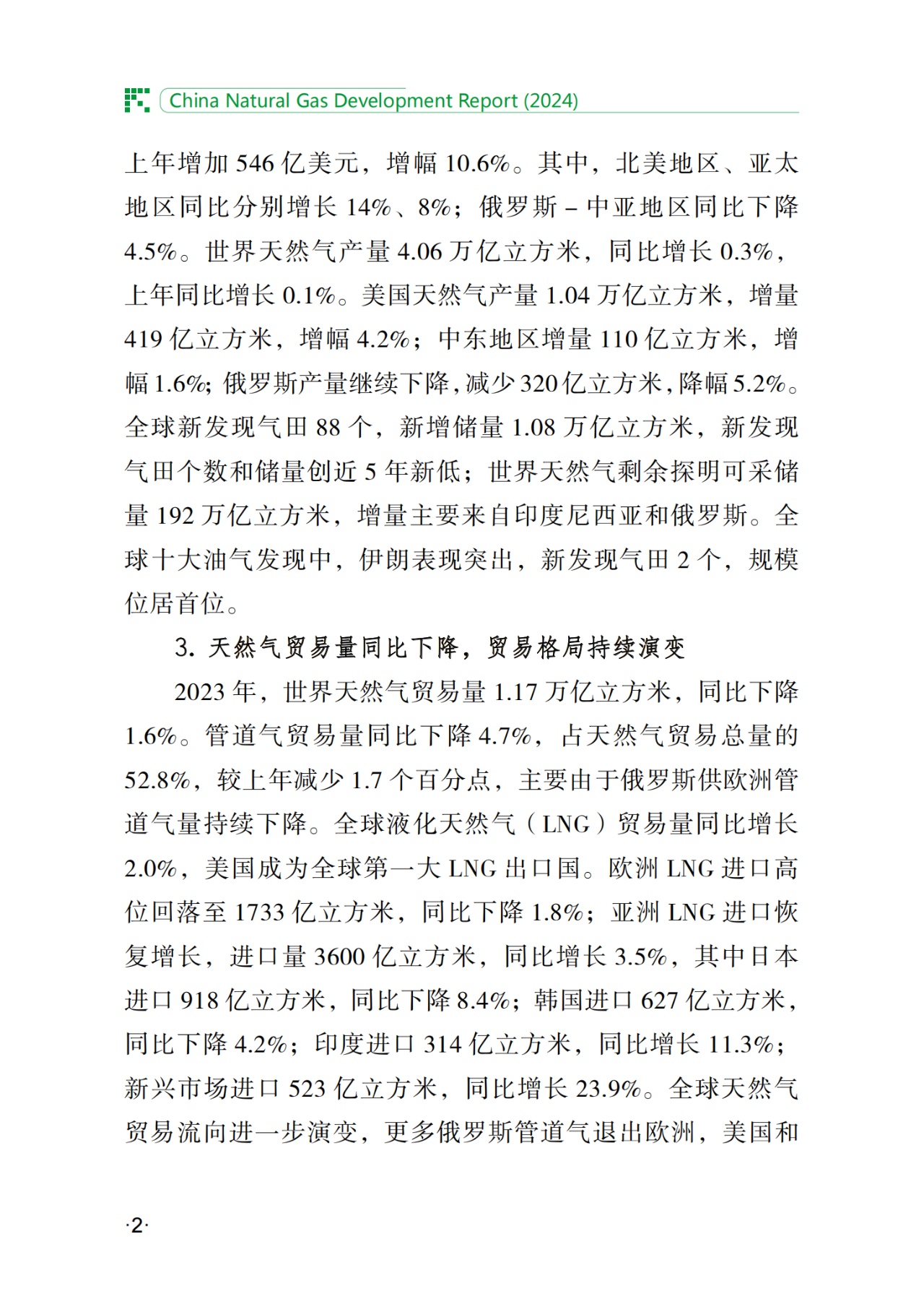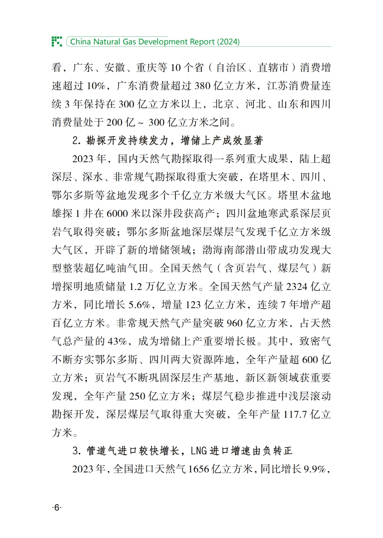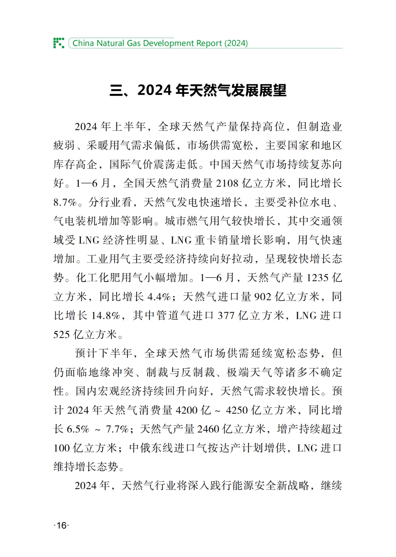 报告显示,2024年上半年,全球天然气产量保持高位,但制造业疲弱、采暖用气需求偏低,市场供需宽松,主要国家和地区库存高企,国际气价震荡走低。中国天然气市场持续复苏向好。1-6月,全国天然气消费量2108亿立方米,同比增长8.7%。分行业看,天然气发电快速增长,主要受补位水电、气电装机增加等影响。城市燃气用气较快增长,其中交通领域受LNG经济性明显、LNG重卡销量增长影响,用气快速增加。工业用气主要受经济持续向好拉动,呈现较快增长态势。化工化肥用气小幅增加。1-6月,天然气产量1235亿立方米,同比增长4.4%;天然气进口量902亿立方米,同比增长14.8%,其中管道气进口377亿立方米,LNG 进口525亿立方米。