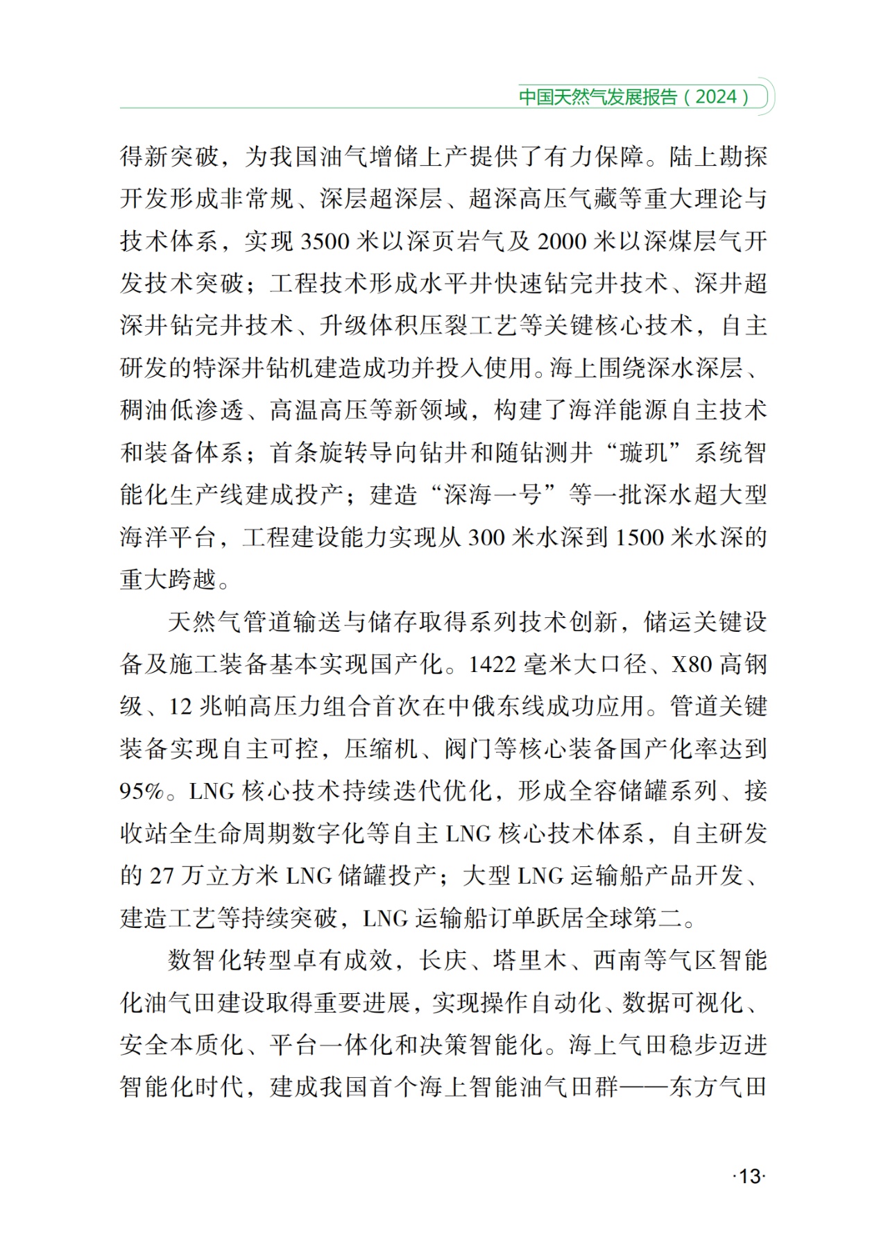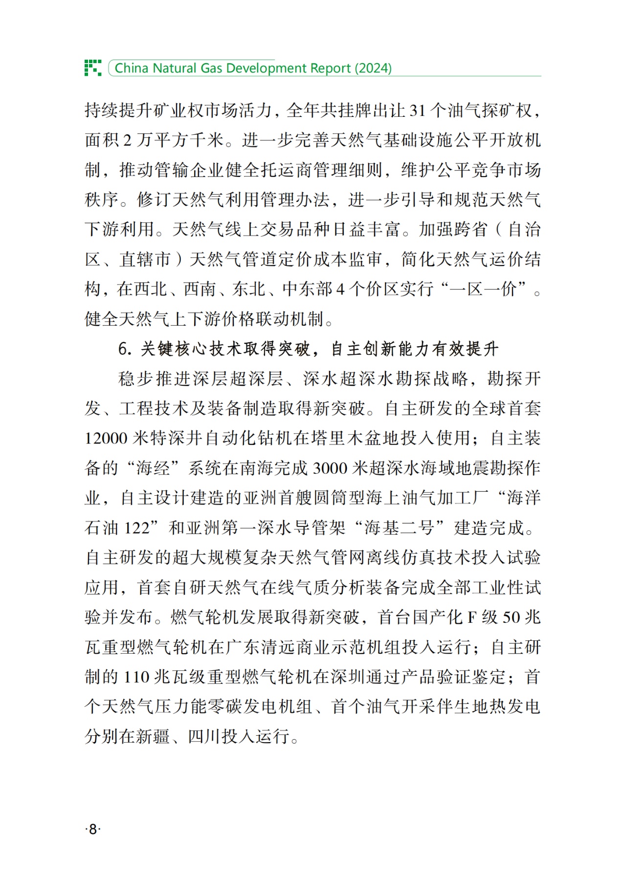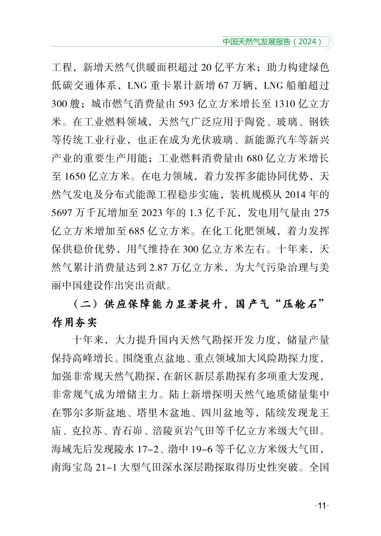 报告显示,2024年上半年,全球天然气产量保持高位,但制造业疲弱、采暖用气需求偏低,市场供需宽松,主要国家和地区库存高企,国际气价震荡走低。中国天然气市场持续复苏向好。1-6月,全国天然气消费量2108亿立方米,同比增长8.7%。分行业看,天然气发电快速增长,主要受补位水电、气电装机增加等影响。城市燃气用气较快增长,其中交通领域受LNG经济性明显、LNG重卡销量增长影响,用气快速增加。工业用气主要受经济持续向好拉动,呈现较快增长态势。化工化肥用气小幅增加。1-6月,天然气产量1235亿立方米,同比增长4.4%;天然气进口量902亿立方米,同比增长14.8%,其中管道气进口377亿立方米,LNG 进口525亿立方米。