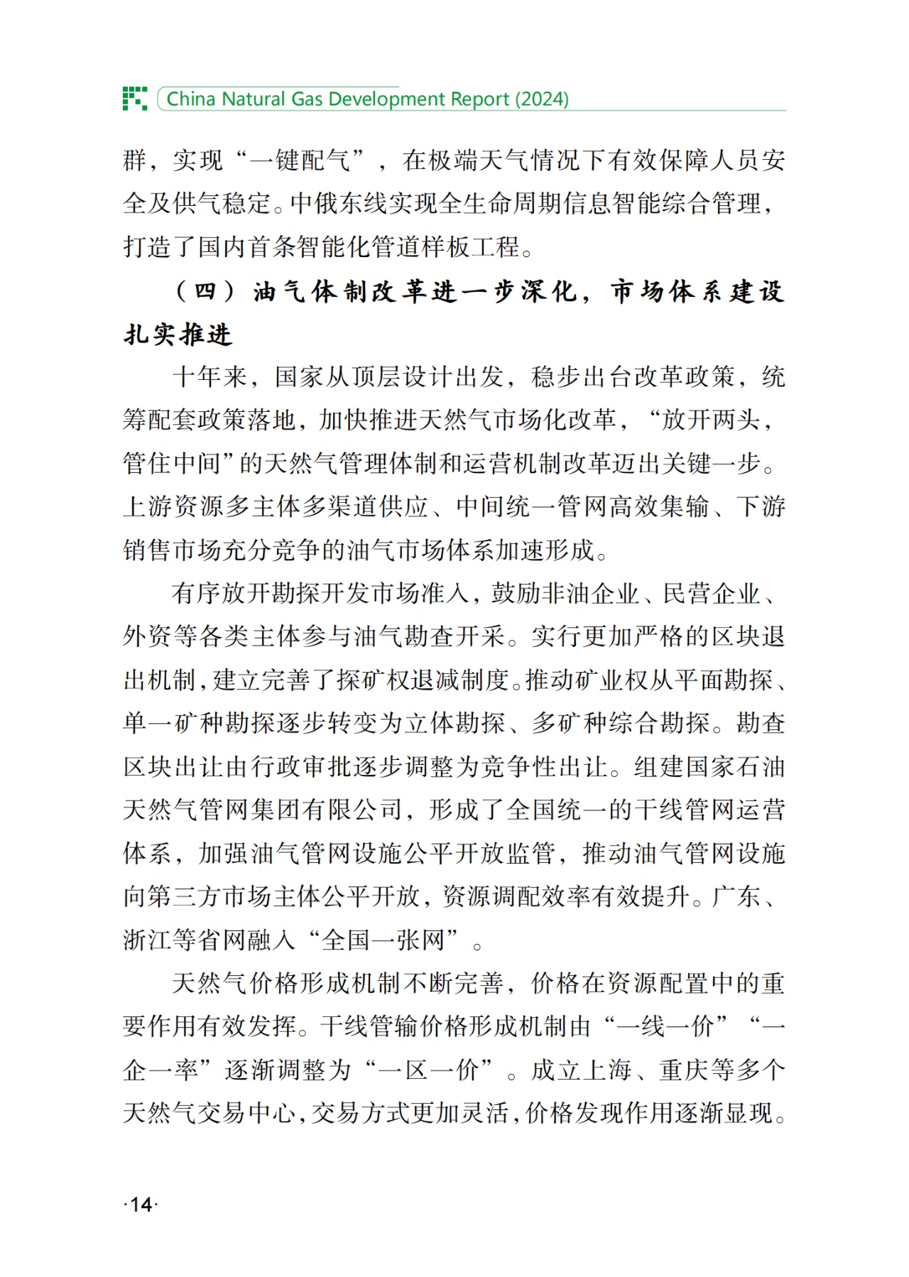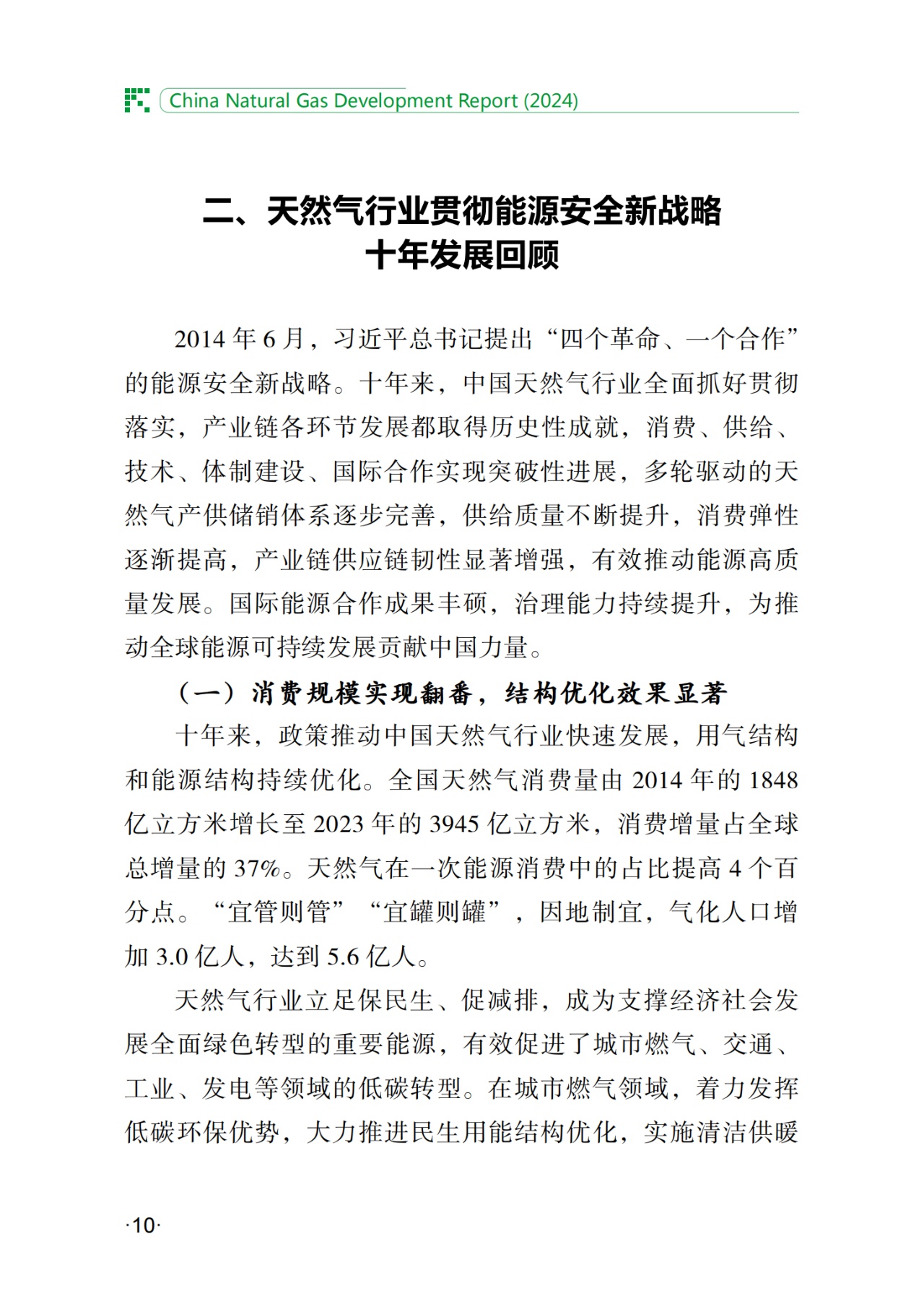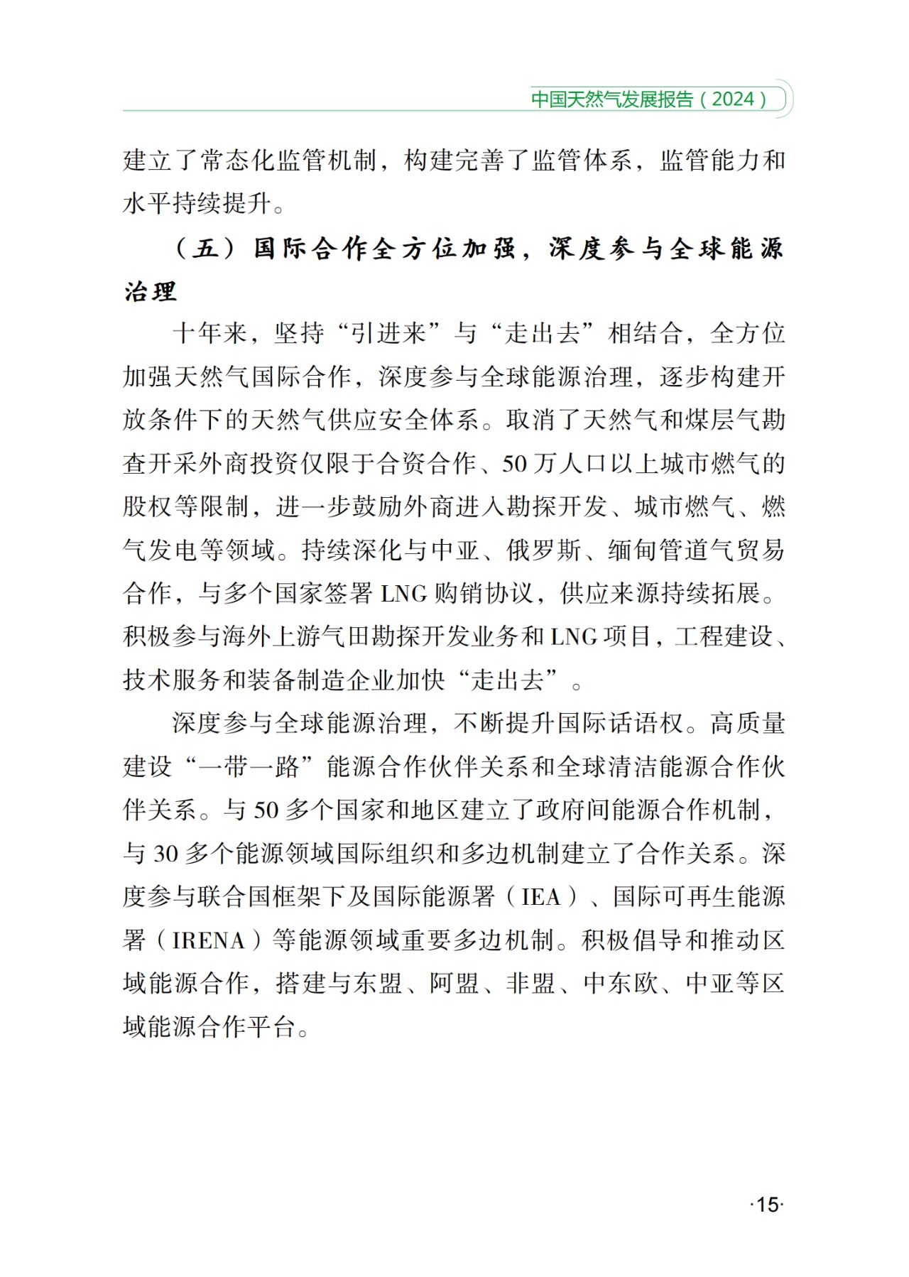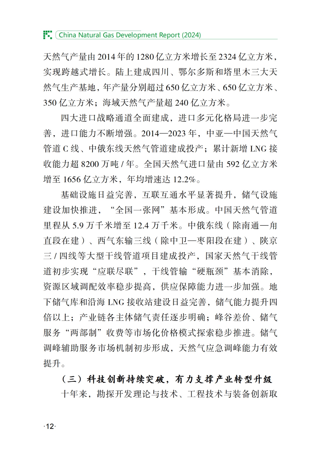 报告显示,2024年上半年,全球天然气产量保持高位,但制造业疲弱、采暖用气需求偏低,市场供需宽松,主要国家和地区库存高企,国际气价震荡走低。中国天然气市场持续复苏向好。1-6月,全国天然气消费量2108亿立方米,同比增长8.7%。分行业看,天然气发电快速增长,主要受补位水电、气电装机增加等影响。城市燃气用气较快增长,其中交通领域受LNG经济性明显、LNG重卡销量增长影响,用气快速增加。工业用气主要受经济持续向好拉动,呈现较快增长态势。化工化肥用气小幅增加。1-6月,天然气产量1235亿立方米,同比增长4.4%;天然气进口量902亿立方米,同比增长14.8%,其中管道气进口377亿立方米,LNG 进口525亿立方米。