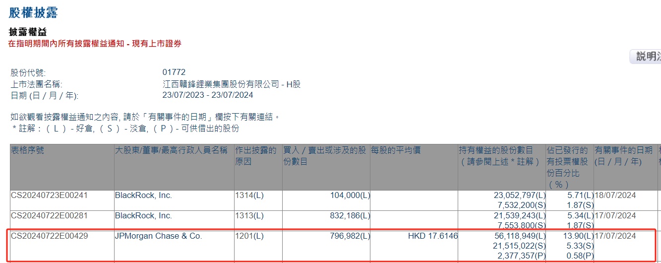 智通财经APP获悉,香港联交所最新资料显示,7月17日,摩根大通减持赣锋锂业(01772)79.6982万股,每股作价17.6146港元,总金额约1403.85万港元。减持后最新持股数目约5611.89万股,最新持股比例13.9%。