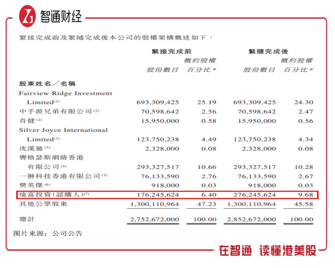 智通财经APP了解到,7月22日,中手游发布公告,称远富投资已按每股1.68港元完成认购1亿股公司股份,认购的股份占完成后已发行股份3.51%。远富投资由朱一航全资拥有,此次定增完成后,朱一航持有中手游的股数增加至2.76亿股,持股比例升至9.68%。公告次日,该公司股价大幅高开10%。