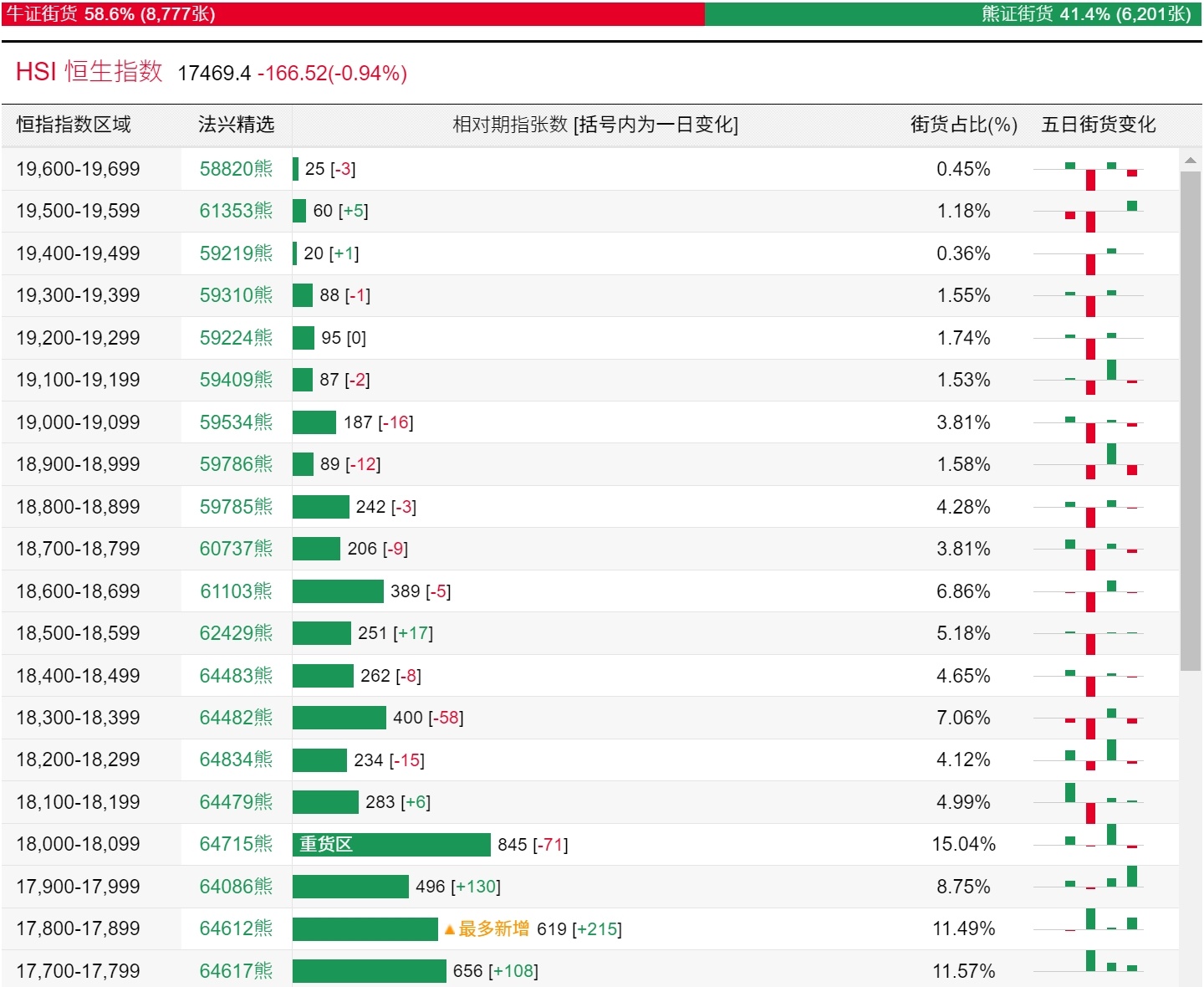 法兴恒指牛熊证街货分布图中的数据显示,熊证街货重货区在18000-18099区间,该区间最新熊证数量为845张,较上一交易日减少71张;最多新增在17800-17899区间,该区间最新熊证数量为619张,较上一交易日增加215张。