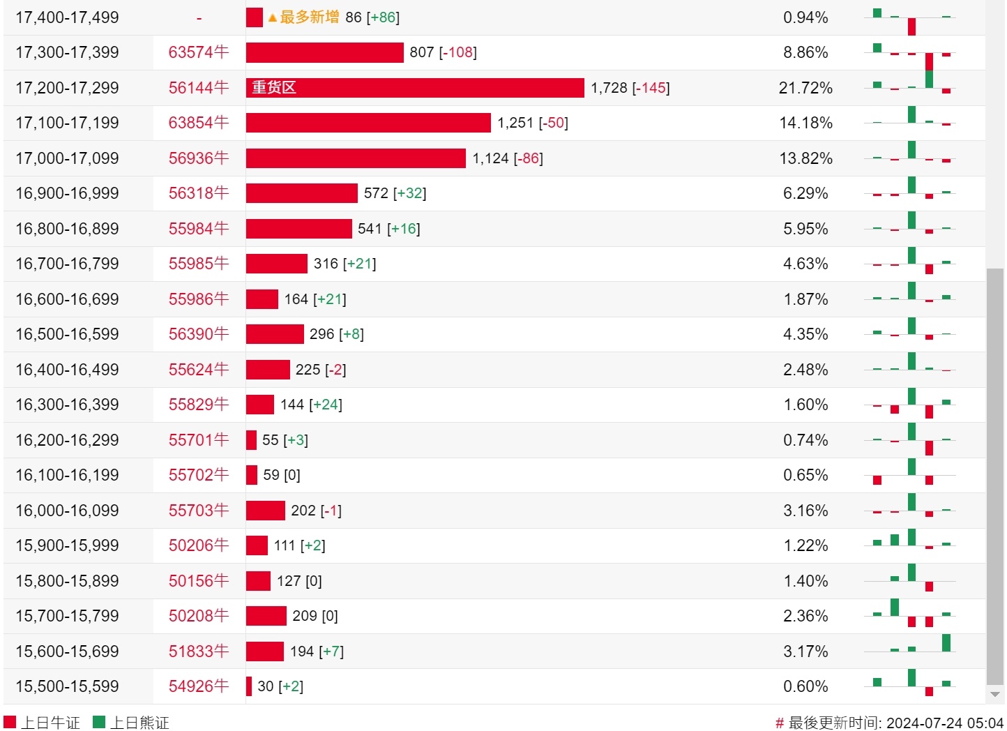 牛证街货重货区在17200-17299区间,该区间最新牛证数量为1728张,较上一交易日减少145张;最多新增在17400-17499区间,该区间最新牛证数量为86张,较上一交易日增加86张。