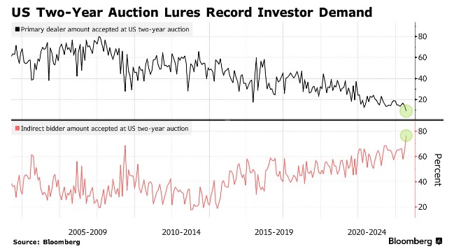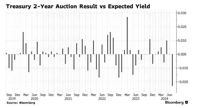 根据自2019年以来编制的记录,预期收益率与投资者获得的收益率之间存在最大差异,突显了对两年期国债的需求规模。在美联储即将降息之际,接近纪录高位的6.154万亿美元货币市场基金也是两年期国债销售强劲背后的一个因素。