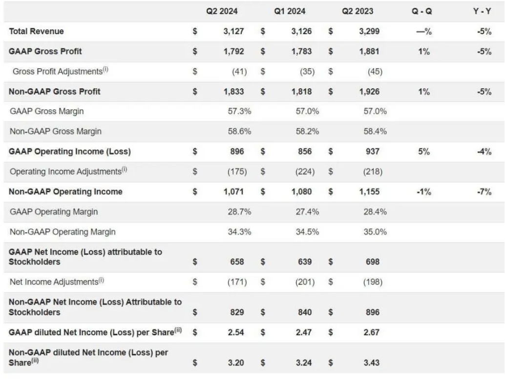 回到Q2季度,从关键财务数据来看,恩智浦当期营收31.3亿美元,同比下降5.2%,大致符合此前分析师预期;当季非GAAP口径下稀释后每股净利润为3.20美元,同比下降6.7%,环比下降1.2%,也符合预期。