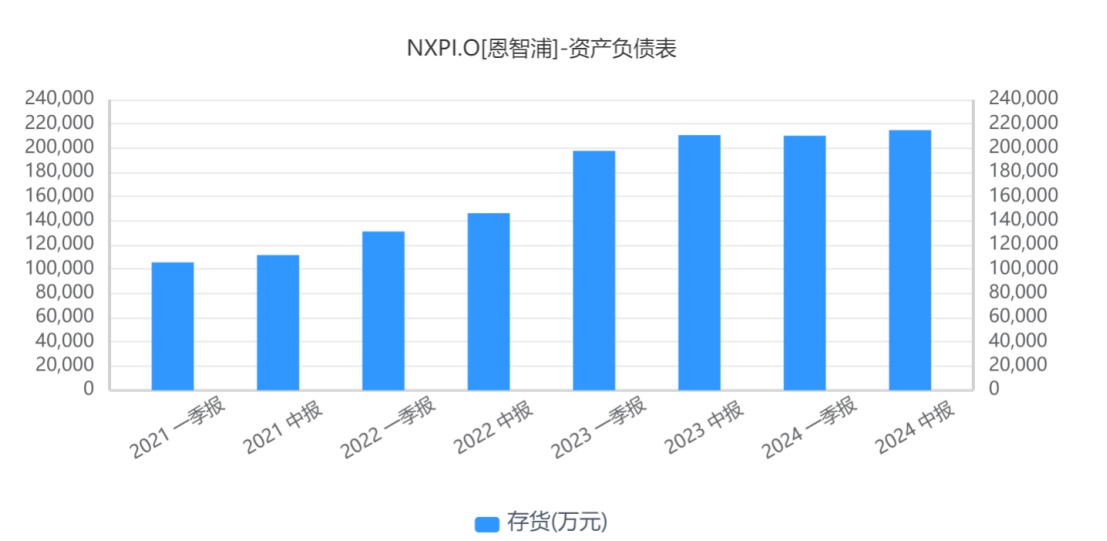 而在非GAAP口径下,恩智浦Q2毛利为18.33亿美元,同比下降5%;当期毛利率为58.6%,略高于去年同期的58.4%;非GAAP口径下,营业利润为10.71亿美元,同比下降7.3%,营业利润率为34.3%,低于去年Q2的35.0%。与此同时,恩智浦当期存货货值进一步增至21.48亿美元,同比增长1.95%,环比增长2.19%。