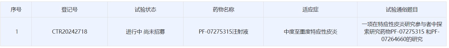 智通财经APP获悉,7月23日,中国药物临床试验登记与信息公示平台显示,辉瑞(PFE.US)在国内登记了一项Ⅱ期临床试验,以评估PF-07275315和PF-07264660在中度至重度特应性皮炎成人受试者中的疗效和安全性。其中,PF-07275315是一款靶向IL-4×IL-13×TSLP的三特异性抗体,PF-07264660是一款靶向IL-4×IL-13×IL-33的三特异性抗体。