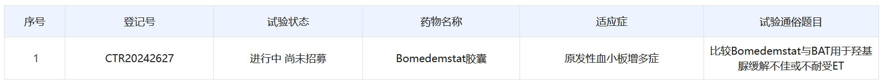 公开信息显示,默沙东正在开展bomedemstat关键性3期随机临床试验,以评估其治疗原发性血小板增多症(ET)患者的效果。而此次在中国启动的3期研究,意味着也将在中国患者群体中研究该药物的疗效和安全性。