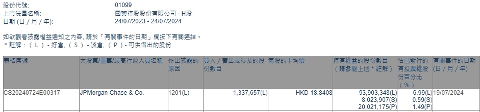智通财经APP获悉,香港联交所最新资料显示,7月19日,小摩减持国药控股(01099)133.7657万股,每股作价18.8408港元,总金额约为2520.25万港元。减持后最新持股数目约为9390.33万股,最新持股比例为6.99%。