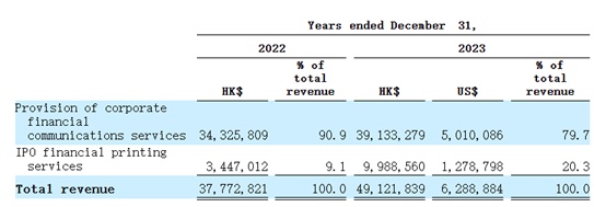 进一步细分来看,该公司最主要的“谋生手段”分为两种,则是企业财务传讯服务和IPO财经印刷服务。其中,2022-2023年内,公司企业财务传讯服务收入分别占总收入的90.9%及79.7%,是不折不扣的顶梁柱。