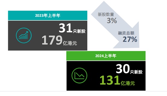据Choice数据显示,2024年1-6月,香港新上市公司为30家,其中29家为主板上市、1家GEM(创业板)上市,募资总额约130亿港元,低于去年同期水平。
