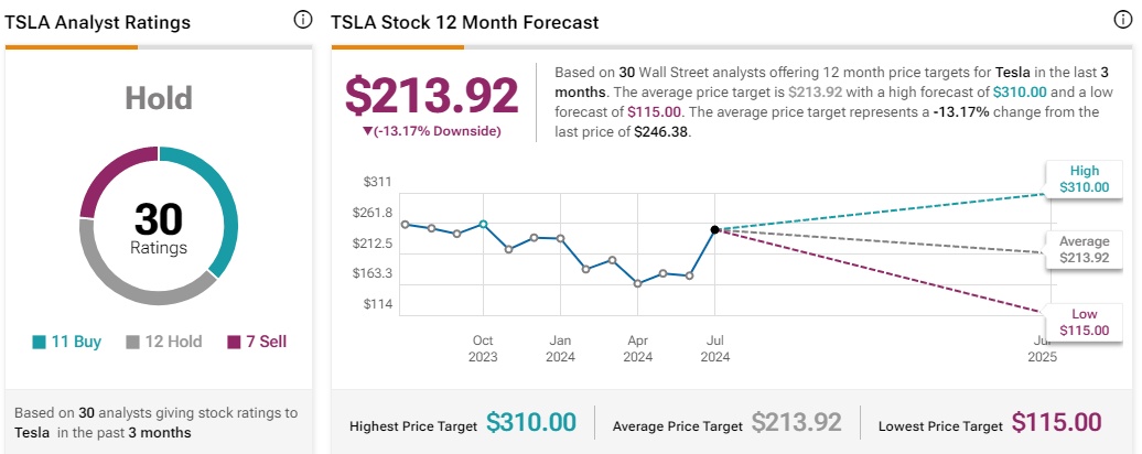 根据TipRanks的数据,总体而言,华尔街分析师予特斯拉“持有”评级,平均目标价为213.92美元,较当前水平低13%。
