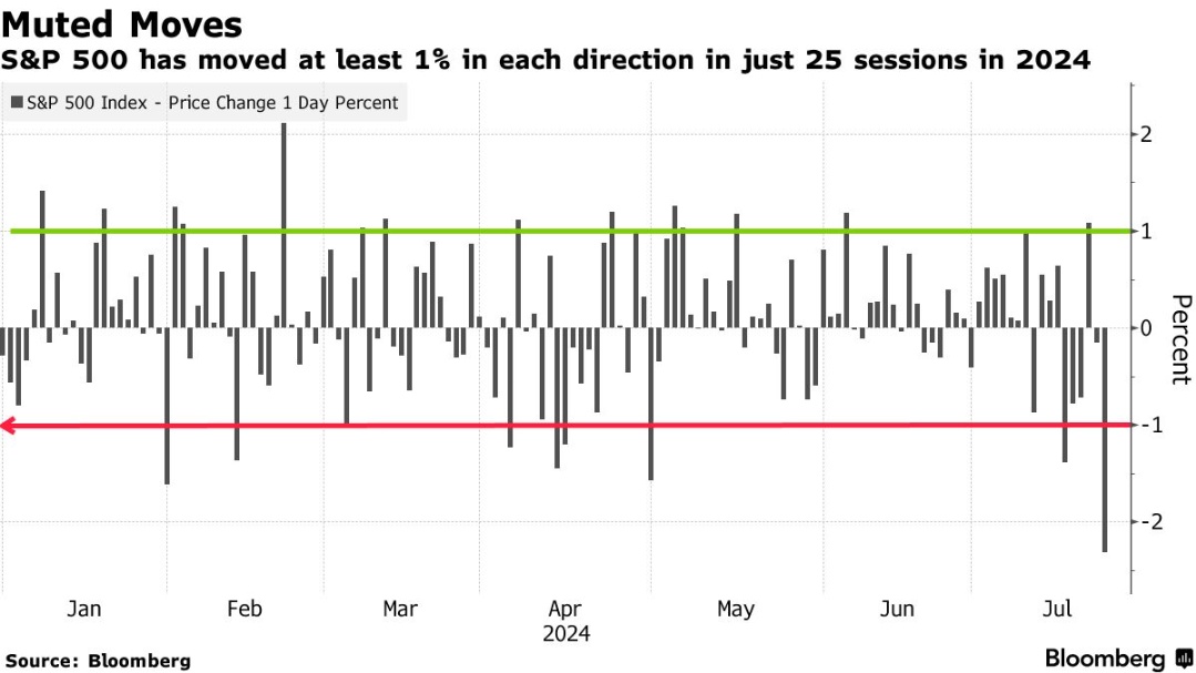 然而,这些股票的强势不足以阻止标普500创下356天内首次2%的跌幅。数据显示,标普500指数自2022年10月触及低点以来,已经累计增加了17万亿美元的市值,创下本世纪迄今为止的最佳表现之一,仅次于2021年的表现。然而,今年的141个交易日中,标普500指数仅有25个交易日的涨跌幅度达到了至少1%,显示出市场的波动性有所下降。