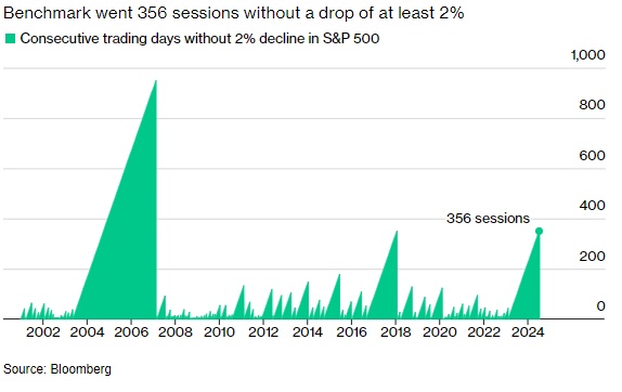 智通财经APP获悉,随着科技股的大幅抛售,标普500指数遭遇了自2022年12月以来最严重的单日跌幅,打破了自2007年全球金融危机以来一直保持的记录——从未出现过2%以上的单日下跌。据数据显示,周三美股基准指数下跌了2.3%,此前的356个交易日,该指数的跌幅都未曾超过2%,这一表现创下了17年来的最长纪录。该指数在上周曾一度超越200日移动平均线15%,这一关键水平历史上曾预示着市场抛售。
