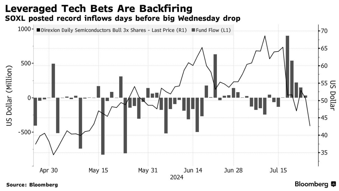 提供三倍于纽约证券交易所半导体指数日波动的Direxion Daily Semiconductors Bull 3x Shares(SOXL.US)周三暴跌15%,延续了过去14天37%的跌幅。仅在上周,该基金就吸纳了创纪录的15亿美元资金。市值230 亿美元的 ProShares UltraPro QQQ(TQQQ.US)和 40 亿美元的 ProShares UltraPro S&P 500(UPRO.US)分别下跌近 7% 和 11%,而上周累计流入资金约为 6.5 亿美元。三只ETF的资金流入合集超过了20亿美元。
