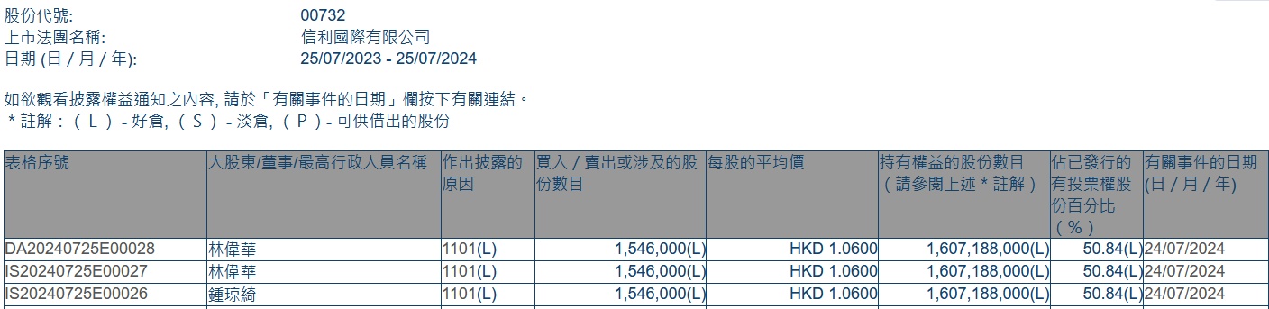 智通财经APP获悉,香港联交所最新资料显示,7月24日,集团主席兼执行董事林伟华增持信利国际(00732)154.6万股,每股作价1.06港元,总金额约为163.88万港元。增持后最新持股数目约为16.07亿股,最新持股比例为50.84%。