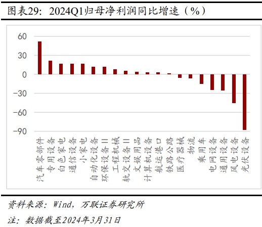 万联证券梳理了从大规模设备更新及消费品以旧换新涉及的主要细分领域业绩表现,根据24Q1财务数据看,在设备更新及消费品以旧换新覆盖的主要行业中,20个申万二级行业,其中13个行业24Q1实现归母净利润同比正增长,汽车零件、专用设备、白色家电净利润增速较高。