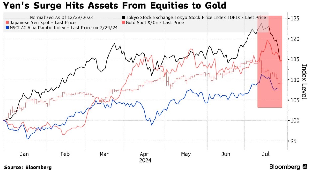 智通财经APP注意到,随着投资者重新评估他们的杠杆押注,日元的惊人复苏正在颠覆全球市场,打击从日本股市到黄金和比特币等资产。