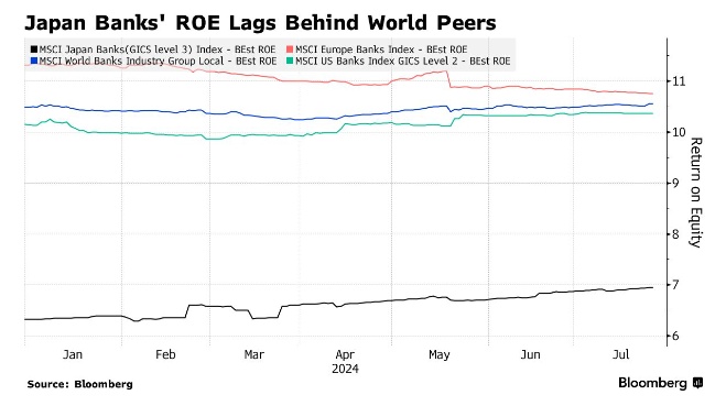 Bloomberg Intelligence分析师Hideyasu Ban在一份报告中写道,截至6月底,日本银行的市净率已从去年12月底的0.66倍升至0.85倍,如果日本央行进一步加息,更多银行的股本回报率将超过8%。