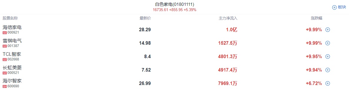 主力资金方面,资金青睐白色家电等行业;资金出逃半导体、工业金属、银行等行业。