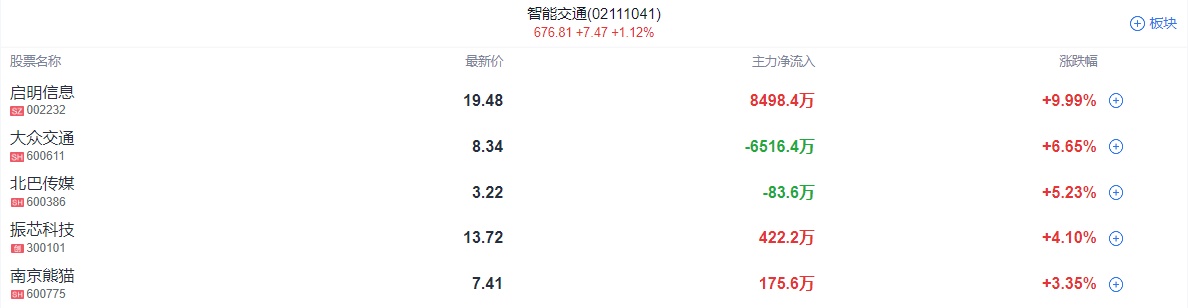 智能交通概念股持续活跃,富临运业2连板,启明信息涨停,东风汽车涨超5%,安凯客车、宇通客车、大众交通、路畅科技、兴民智通等跟涨。