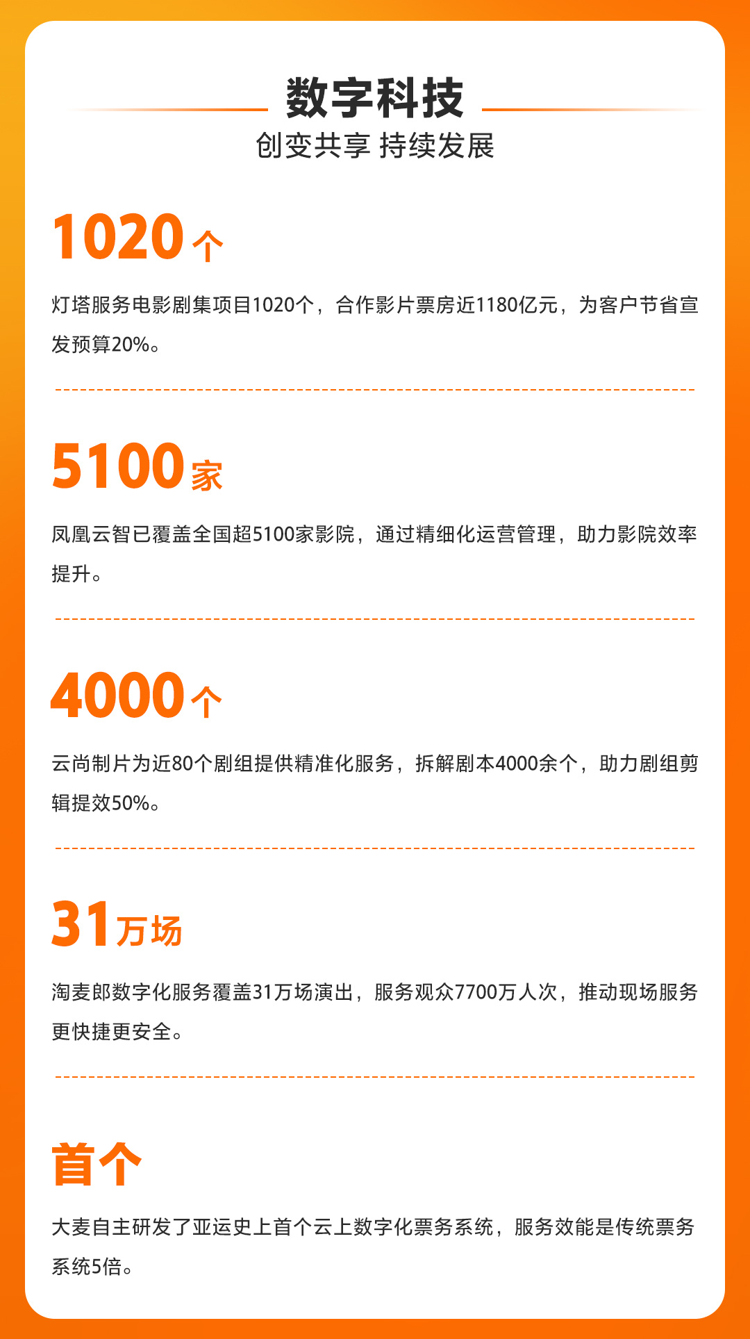 科技方面,阿里影业布局未来,持续发力科技板块,以推动创新科技在影视内容创作领域的应用,助力文娱行业的数字化升级。灯塔数字宣发平台不断升级数字化服务能力,提效影视宣发,累计服务电影剧集项目1020个,合作影片票房近1180亿元,为客户节省宣发预算20%;凤凰云智作为专业的影院数字化经营管理开放平台,已覆盖全国超5100家影院,通过精细化运营管理,助力影院效率提升;云尚制片将剧组内容生产管理与数字化技术相融合,已为近80个剧组提供精准化服务,拆解剧本4000余个,助力剧组剪辑提效50%。