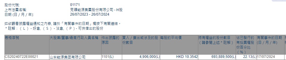 智通财经APP获悉,香港联交所最新资料显示,7月17日,山东能源集团有限公司增持兖矿能源(01171)490.6万股,每股作价10.3542港元,总金额约为5079.77万港元。增持后最新持股数目约为6.94亿股,最新持股比例为22.13%。