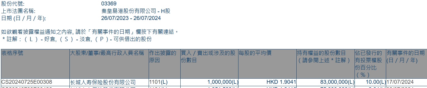 智通财经APP获悉,香港联交所最新资料显示,7月17日,长城人寿增持秦港股份(03369)100万股,每股作价1.9041港元,总金额约为190.41万港元。增持后最新持股数目为8300万股,持股比例为10%。