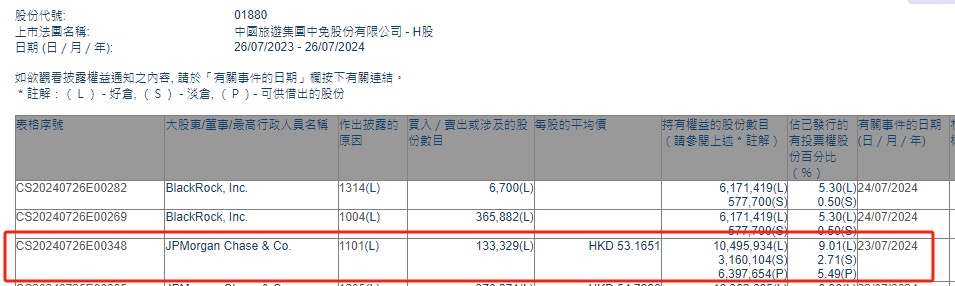 智通财经APP获悉,香港联交所最新资料显示,7月23日,小摩增持中国中免(01880)13.3329万股,每股作价53.1651港元,总金额约708.84万港元。增持后最新持股数目约1049.59万股,最新持股比例为9.01%。
